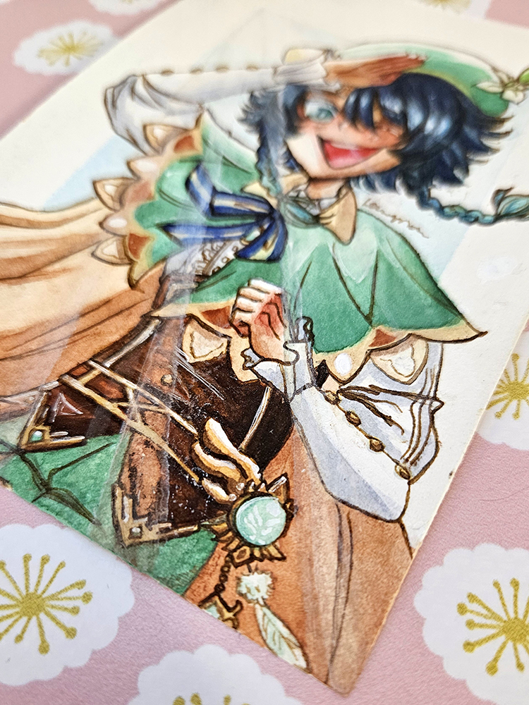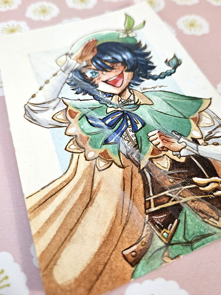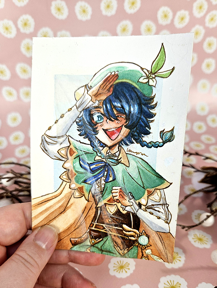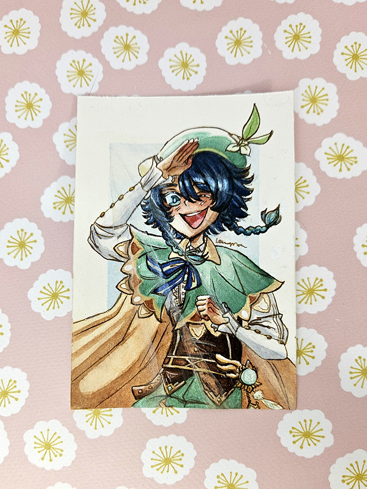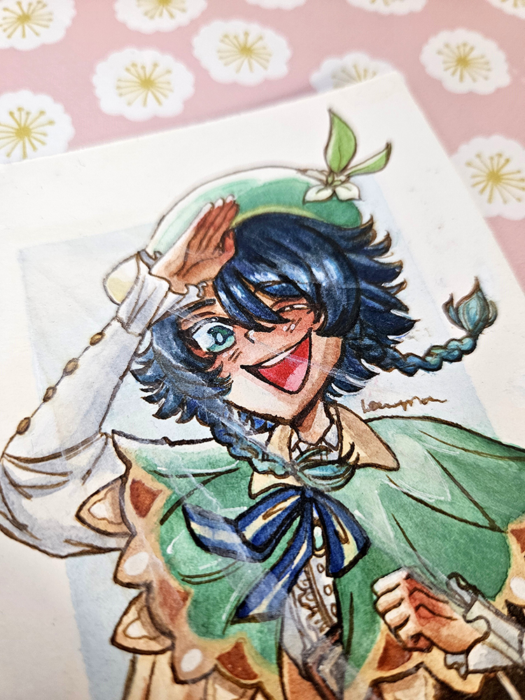 A watercolour mini illustration of Venti from Genshin Impact